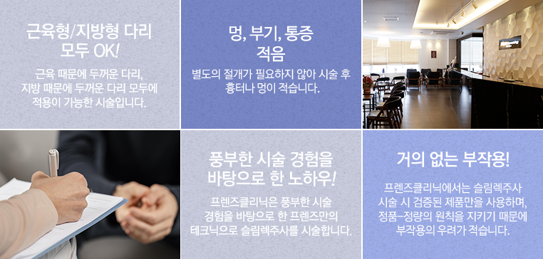 ½½¸²·ºÁÖ»ç´Â ¸» ±×´ë·Î ½½¸²ÇÑ ´Ù¸®¶óÀÎÀ» ¸¸µé¾îÁÖ´Â °£´ÜÇÑ ÁÖ»ç½Ã¼úÀÔ´Ï´Ù. º¸Åë ±ÙÀ°Çü ´Ù¸®´Â º¸Å彺·Î, Áö¹æÇü ´Ù¸®´Â ºñ¸¸ÁÖ»ç·Î ÇØ°áÀ» ÇßÁö¸¸ ´Ù¸®¿¡ ±ÙÀ°°ú Áö¹æÀÌ ¸ðµÎ ºÐÆ÷Çϰí ÀÖ¾î ÇÑ °¡Áö Ä¡·á¹ý¸¸À¸·Î´Â ÇØ°áÀÌ ¾î·Á¿ü´ø ´Ù¸®¶óÀÎÀ» °³¼±ÇÏ´Â µ¥ È¿°ú¸¦ ±â´ëÇÒ ¼ö ÀÖ½À´Ï´Ù. ½½¸²·ºÁÖ»ç´Â º¸Å彺¿Í ºñ¸¸Áֻ縦 µ¿½Ã¿¡ ½Ã¼úÇÏ¿© ±ÙÀ°°ú Áö¹æÀ» µ¿½Ã¿¡ ÁÙ¿©ÁÖ°í, µ¿½Ã¿¡ ź·Â±îÁö ³ô¿©ÁÝ´Ï´Ù.