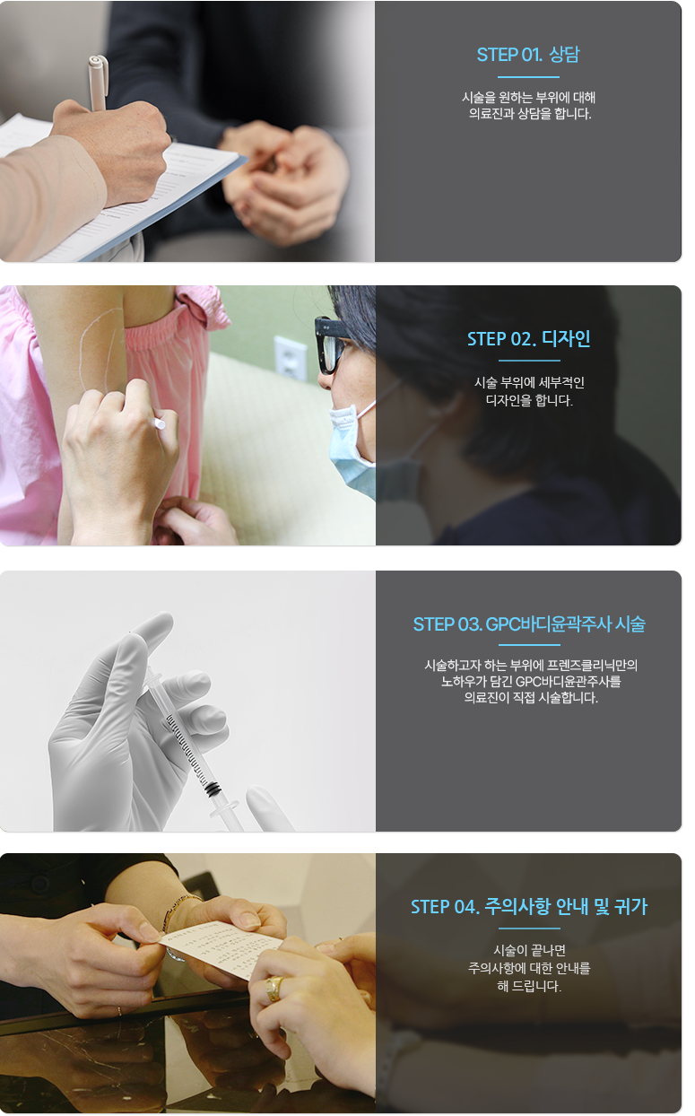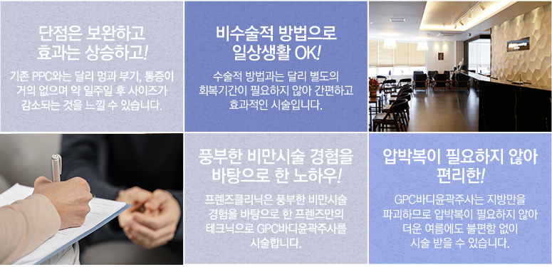 Äá¿¡¼ ÃßÃâµÈ GPC(Glyceryl Phosphoryl Choline)´Â PPC(PhosPhatidy Choline) Àü±¸¹°Áú·Î¼ ±¸Á¶ÀûÀ¸·Î´Â ±âÁ¸ PPCÀÇ ºÐÀÚ 2°³¿¡¼ Áö¹æ»êÀÌ ¶³¾îÁø PPC¿Í À¯»çÇÑ ¹°ÁúÀÔ´Ï´Ù. À̸¦ ÀÌ¿ëÇÑ GPC¹ÙµðÀ±°ûÁÖ»ç´Â PPC¿Í À¯»çÇÑ Àü±¸¹°ÁúÀÎ Äݸ° ¾ËÆ÷¼¼·¹ÀÌÆ®, L-Ä«¸£´Ïƾ µîÀ» »ç¿ëÇÏ¿© º¹ºÎ³ª Çã¹÷Áö, ÆÈ µîÀÇ Áö¹æ¼¼Æ÷°¡ ÁýÁßÀûÀ¸·Î ¸ô·Á ÀÖ´Â ºÎÀ§¿¡ ½Ã¼úÇÏ¿© Áö¹æÀ» °¨¼Ò½ÃÄÑÁÖ´Â ¿ªÇÒÀ» ÇÕ´Ï´Ù. GPC¹ÙµðÀ±°ûÁÖ»ç´Â ±âÁ¸ PPCÁÖ»ç½Ã¼úÀÇ ºÒÆíÇÔÀ¸·Î ²ÅÇû´ø ºÎÁ¾, ºÎ±â°¡ ÀûÀ¸¸ç 1´Þ¿¡ Çѹø ÁøÇàÇÏ¿´´ø PPCº¸´Ù GPC¹ÙµðÀ±°ûÁÖ»ç¿ä¹ýÀº 1ÁÖ¿¡ Çѹø¾¿ ȤÀº 2ȸ 3ȸµµ °¡´ÉÇÏ¸ç °³°³ÀÎÀÇ »óÅ¿¡ ¸ÂÃß¾î ½ºÄÉÁÙÀÌ ÁøÇàµË´Ï´Ù.